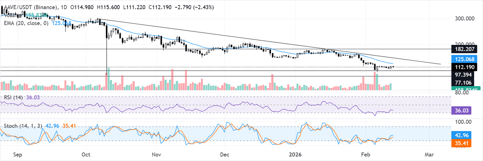 En el gráfico diario, AAVE/USDT cotiza a 112.19 $, un aumento de aproximadamente el 2% en las últimas 24 horas. La media móvil exponencial (EMA) de 20 días en 125.06 $ desciende, manteniendo al par limitado por debajo de su resistencia dinámica. La media continúa disminuyendo, reforzando un sesgo bajista.