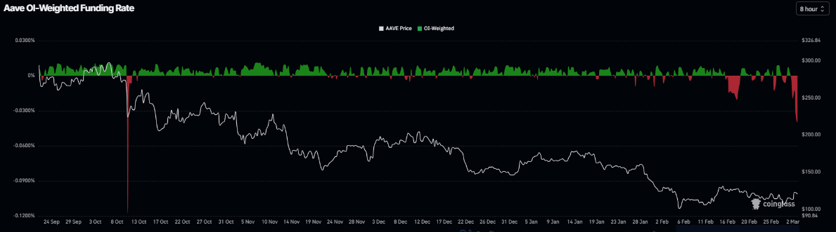 En el lado de los derivados, los datos de tasas de financiación de CoinGlass proyectan una perspectiva bajista para AAVE. La métrica se volvió negativa el lunes y se sitúa en -0,040% el martes, el nivel más bajo desde el 11 de octubre y acercándose a los niveles vistos durante la caída del mercado del 10 de octubre. Estas tasas negativas indican que los cortos están pagando a los largos, sugiriendo un sentimiento bajista hacia AAVE.