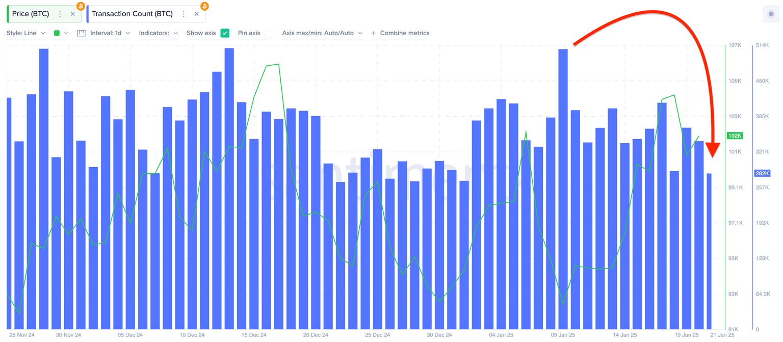El precio del Bitcoin alcanzó un 25% de ganancias en lo que va del año cuando cruzó los 109.000$ el lunes, impulsado por especulaciones positivas en torno a las aprobaciones de ETF y políticas amigables con las criptomonedas, calentándose antes de la investidura de Trump. Sin embargo, ha habido una considerable disminución en el conteo de transacciones en cadena de BTC desde el 9 de junio.