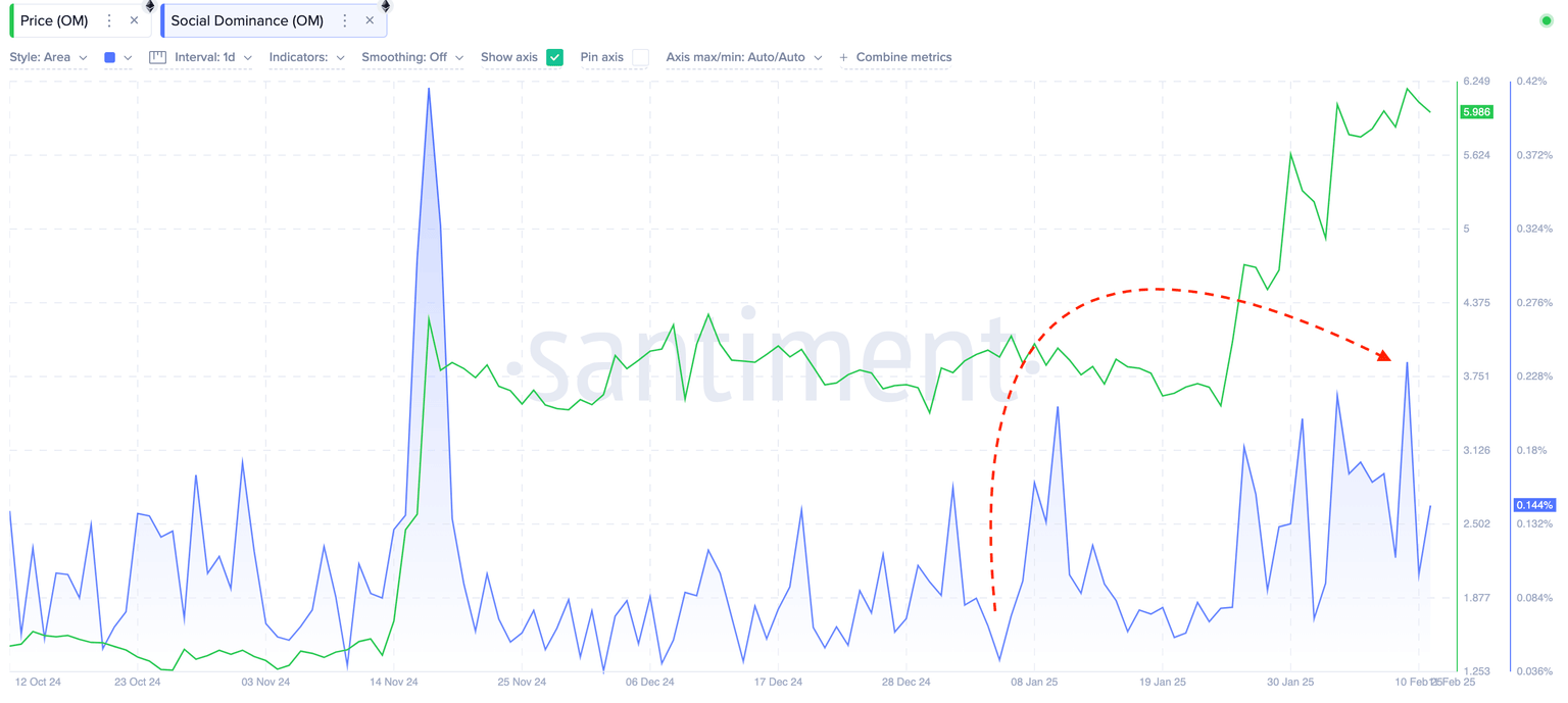 Apoyando esta perspectiva, el gráfico de Dominancia Social de Santiment destaca la creciente influencia de OM dentro de la comunidad cripto.