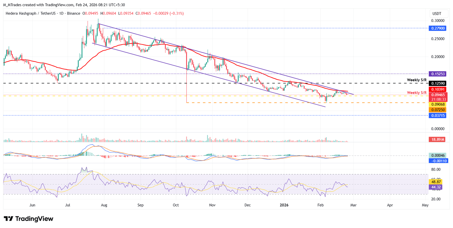 El precio de Hedera fue rechazado alrededor de la media móvil exponencial (EMA) de 50 días en 0.103$ el 14 de febrero y cayó un 8.5% hasta el lunes. Este nivel de EMA de 50 días coincide aproximadamente con la línea de tendencia superior de un patrón de cuña descendente (dibujado al conectar múltiples máximos y mínimos desde finales de junio), convirtiéndolo en una zona de resistencia clave. Al momento de escribir el martes, HBAR se cotiza a 0.094$.