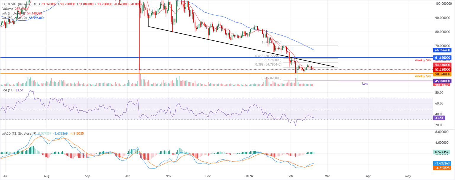 Litecoin cotiza a 53,28$ en el momento de escribir el jueves. La media móvil simple (SMA) de 9 días en 54,14$ se mantiene por debajo de la SMA de 50 días en 66,99$, con ambas inclinándose a la baja para subrayar una configuración bajista.