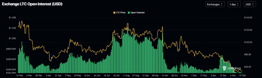 El OI de futuros de Litecoin cae a 341,27 millones de dólares el jueves, habiendo estado en constante declive desde mediados de enero. Esta caída en el OI refleja una disminución en la participación de los inversores y proyecta un panorama bajista.