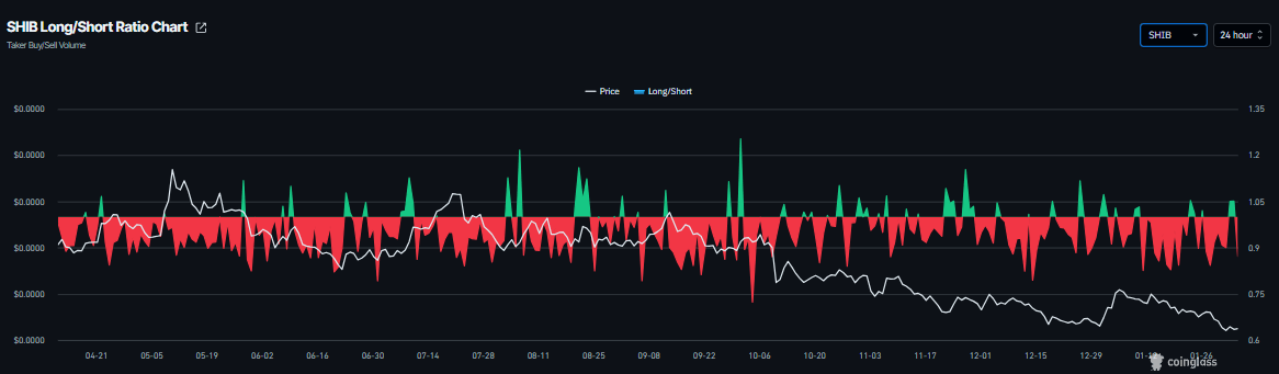 De manera similar, el mercado de derivados es cauteloso. Los datos de CoinGlass muestran que la tasa de financiación de SHIB se volvió positiva el miércoles, actualmente en 0.0088%, lo que indica que las posiciones largas están pagando a las cortas y sugiere un sentimiento alcista. Sin embargo, la relación larga-corta ha caído a 0.87 en el mismo período, señalando un aumento en las apuestas cortas. Esta divergencia resalta la creciente incertidumbre en el mercado de derivados y debilita la convicción alcista.