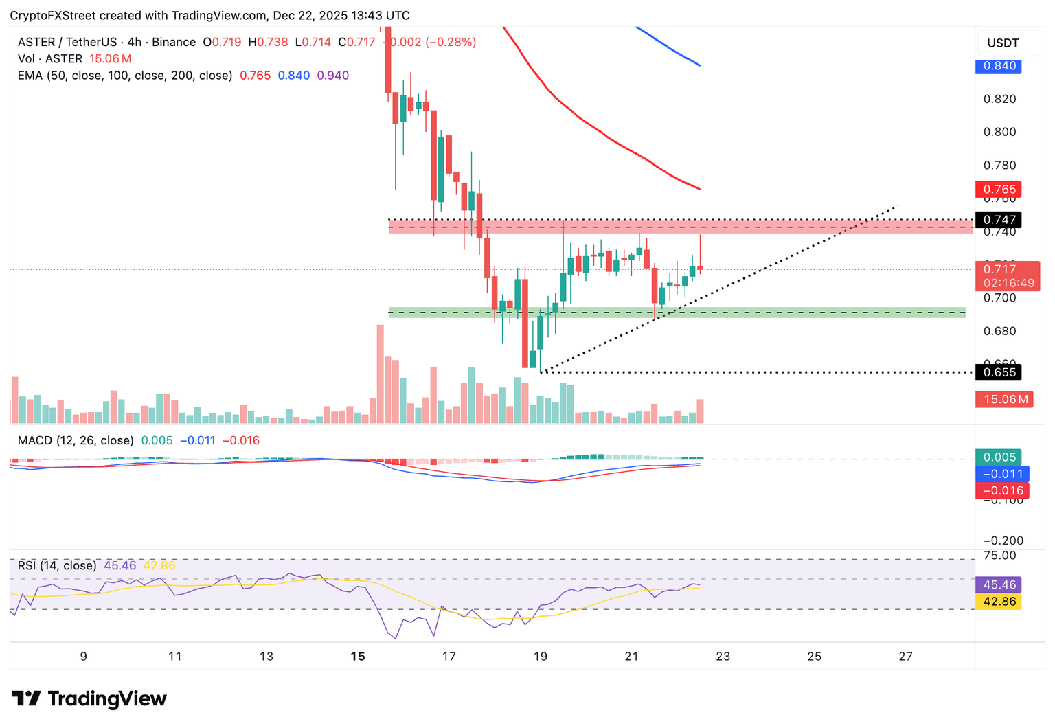 - Aster extiende su recuperación por encima de 0.70$, el sentimiento mejora en el mercado de criptomonedas el lunes.