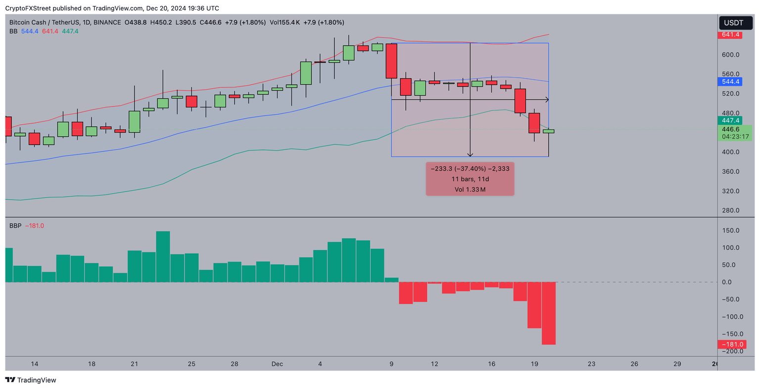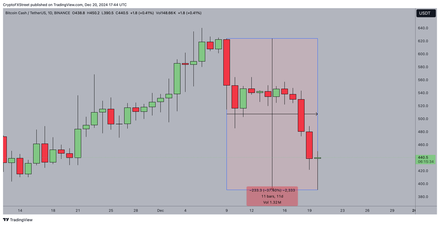 Bitcoin Cash (BCH) enfrenta una resistencia significativa en 450 $ después de una fuerte caída del 37% en los últimos 11 días.