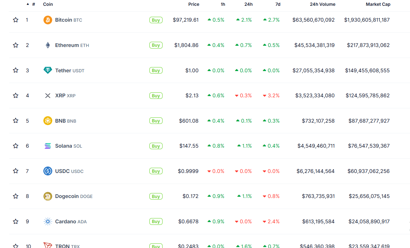 Bitcoin se cotizó por encima de 97.000$ el miércoles, manteniendo una ganancia del 2% mientras el mercado de criptomonedas permaneció impasible tras la decisión de la Fed. Otros activos principales, Ethereum (ETH), XRP, Solana (SOL) y Dogecoin (DOGE), también se mantuvieron estables con pocos cambios en los precios.