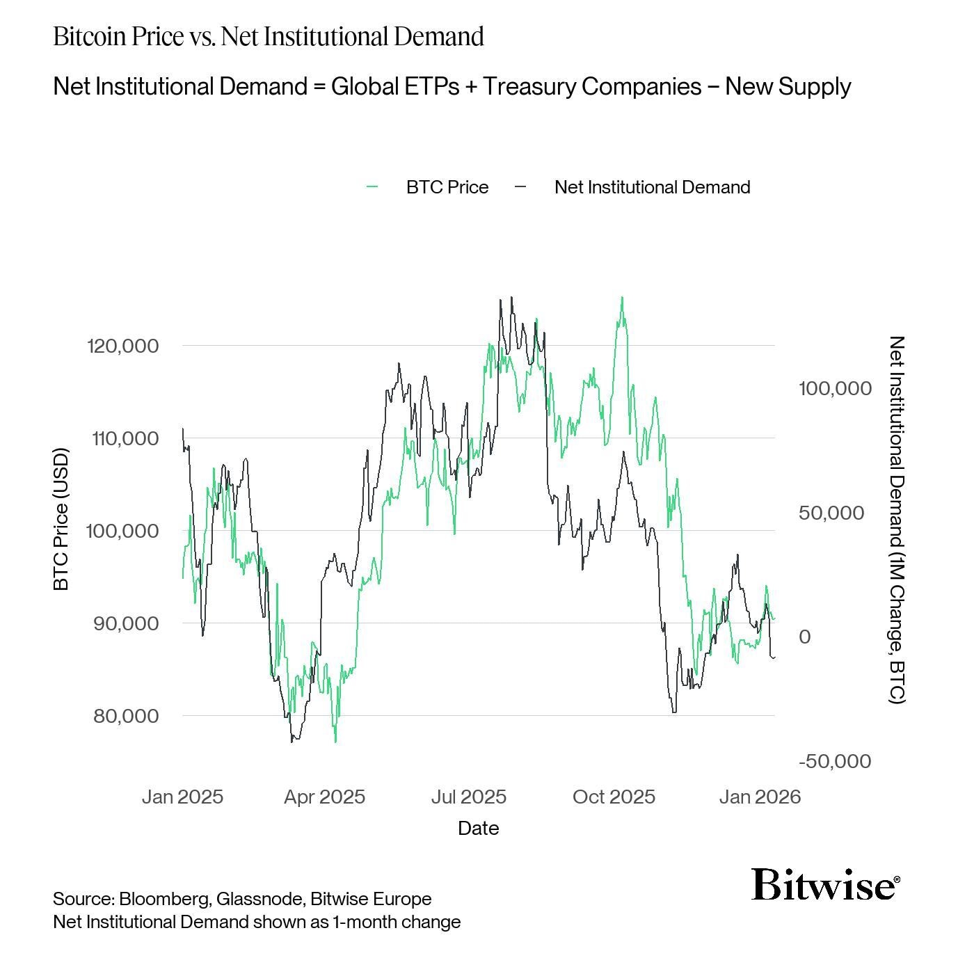 El precio del Bitcoin ha seguido en gran medida la demanda institucional neta durante el último año, según Bitwise. La demanda institucional neta es la actividad de compra de productos cotizados en bolsa (ETP) globales y empresas de tesorería menos el nuevo suministro.