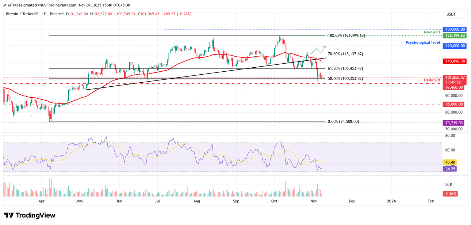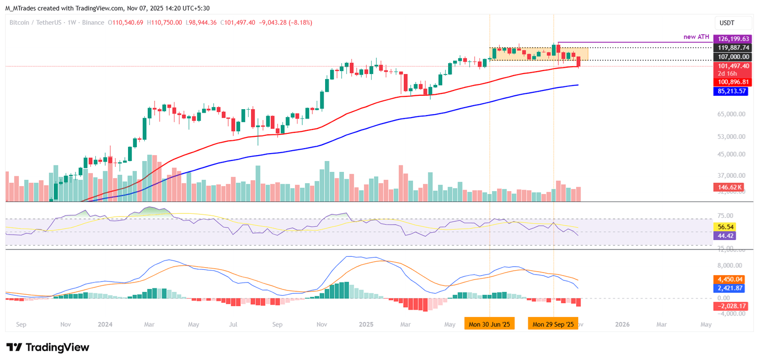 El gráfico semanal de Bitcoin muestra una corrección de más del 20% desde su máximo histórico de 126.199$ en las últimas cinco semanas, con el precio alcanzando un mínimo de 98.944$ esta semana y volviendo a probar la media móvil exponencial (EMA) de 50 semanas alrededor de 100.896$.