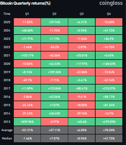 Sumando a este optimismo, el cuarto trimestre (Q4) ha sido el mejor trimestre para BTC en general, con un promedio del 78.03%, lo que podría empujar al BTC a nuevos máximos para finales de año.