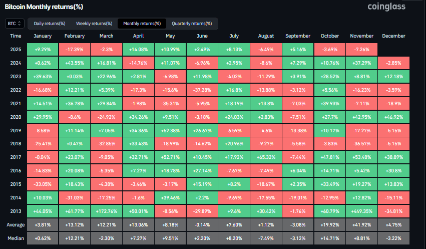 Los datos históricos de CoinGlass muestran que a pesar de que Bitcoin registró una pérdida del 3.69% en octubre — decepcionando a los operadores que anticipaban un repunte de 'Uptober' — noviembre ha sido históricamente el mes más fuerte para BTC, con un retorno promedio del 41.92%.