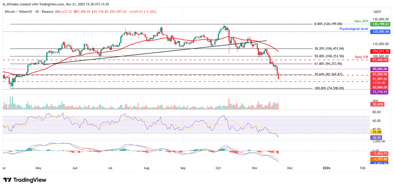 En el gráfico diario, Bitcoin rompe por debajo del nivel de retroceso de Fibonacci del 78.6% en 85.569$ (dibujado desde el mínimo del 7 de abril de 74.508$ hasta el máximo histórico de 126.299$ establecido el 6 de octubre) para cotizar alrededor de 82.000$ en el momento de escribir el viernes.