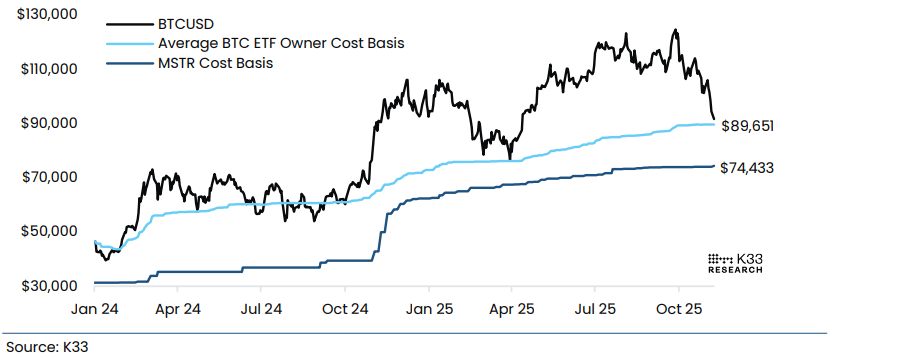 El gráfico a continuación muestra que el coste medio base de los tenedores de ETF de BTC es de 89.651$, un umbral que Bitcoin rompió brevemente en su mínimo del martes de 89.183$, y ahora se encuentra cotizando por debajo de él el viernes. Durante la caída del primer trimestre, BTC tocó fondo exactamente en este nivel medio de entrada de ETF antes de iniciar una recuperación, convirtiéndolo en un área clave a observar nuevamente si BTC se recupera.