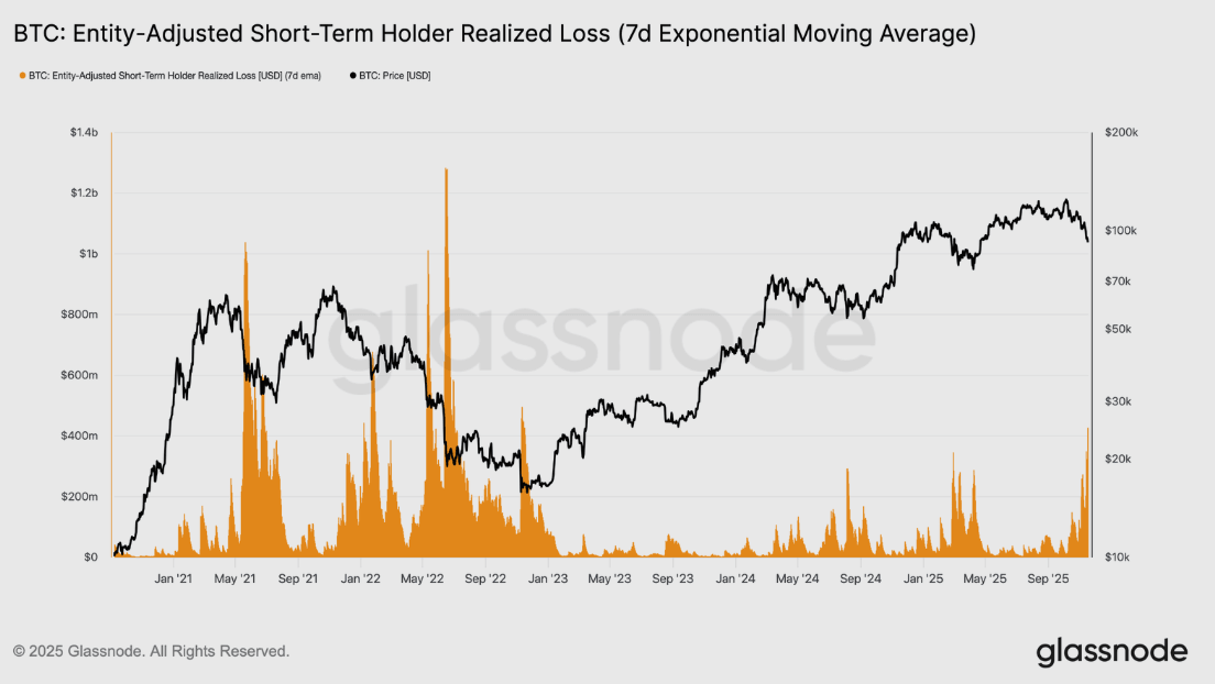 El informe explicó además que un fuerte aumento en la capitulación de los inversores apoya aún más la perspectiva bajista. Esta es la tercera instancia desde principios de 2024 en la que BTC ha roto por debajo de la banda inferior del modelo de coste base de STH, pero la magnitud de la angustia es significativamente mayor. La EMA de 7 días de las pérdidas realizadas de STH ha aumentado a 523 millones $ por día, el nivel más alto registrado desde el colapso de FTX.