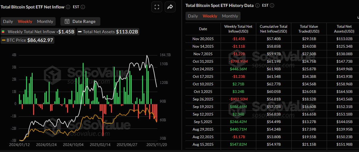 El precio del Bitcoin (BTC) continúa su deslizamiento a la baja, cotizando cerca de 82.000$ en el momento de escribir el viernes y cayendo a mínimos de siete meses, ya que el sentimiento bajista aprieta su agarre en el mercado de criptomonedas. La demanda institucional sigue debilitándose, ya que los fondos cotizados en bolsa (ETFs) de Bitcoin al contado registraron una salida semanal de 1.450 millones de dólares hasta el jueves, marcando la cuarta semana consecutiva de retiros. Además, las condiciones en cadena deterioradas señalan que los operadores aún pueden no haber visto un fondo definitivo, ya que la criptomoneda más grande por capitalización de mercado sigue siendo vulnerable a más caídas en los próximos días.