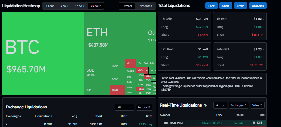 En las últimas 24 horas, 402.738 operadores fueron liquidados, totalizando más de 1.960 millones de dólares en liquidaciones. Más del 92% de estas posiciones eran apuestas largas, destacando el posicionamiento excesivamente alcista de los operadores, mientras que la mayor liquidación individual ocurrió en Hyperliquid – BTC/USD valorada en 36,78 millones de dólares.
