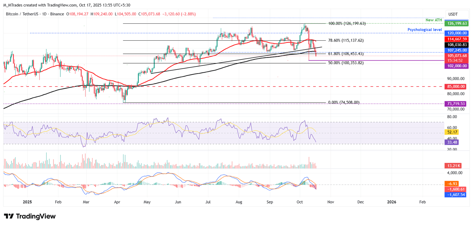 El precio del Bitcoin enfrentó un rechazo de la media móvil exponencial (EMA) de 50 días en 114.667$ el martes y cayó casi un 6% hasta el jueves, cerrando por debajo de la línea de tendencia ascendente. Al momento de escribir el viernes, el BTC continúa cotizando por debajo de 105.000$.