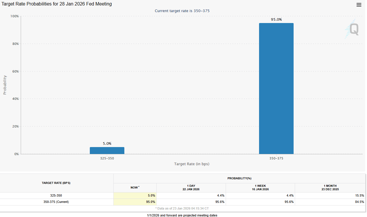 Estas publicaciones de datos están limitando actualmente la recuperación de BTC, ya que un fuerte crecimiento y una inflación persistente reducen las expectativas de un alivio de la política de la Reserva Federal de EE.UU. (Fed) en el corto plazo. La herramienta CME FedWatch, como se muestra a continuación, indica que los participantes del mercado actualmente valoran en más del 95% la probabilidad de que el banco central de EE.UU. mantenga las tasas sin cambios en su reunión del 27-28 de enero.