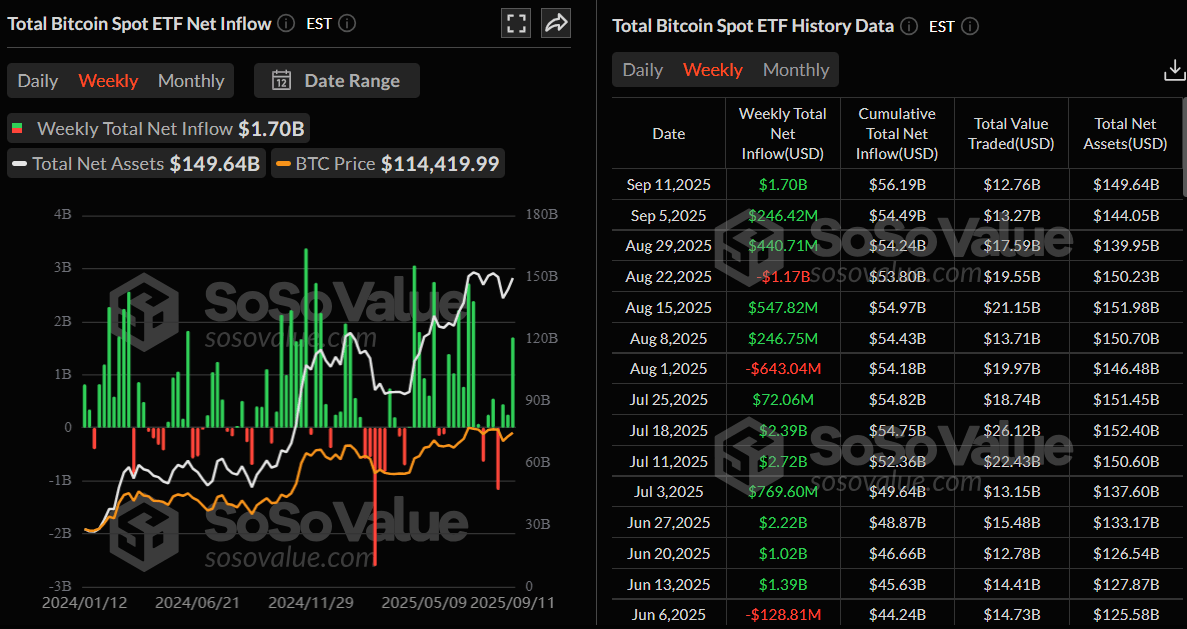 La recuperación del precio del Bitcoin ha sido apoyada por inversores institucionales y corporativos hasta ahora esta semana. Según datos de SoSoValue, como se muestra a continuación, los Fondos Cotizados en Bolsa (ETFs) de Bitcoin al contado registraron un total de 1.700 millones de dólares en entradas hasta el jueves, marcando su tercera semana consecutiva de flujos positivos. Además, la entrada de esta semana fue el flujo semanal más alto desde mediados de julio, señalando una renovada demanda institucional. Si esta entrada continúa e intensifica, el BTC podría experimentar una mayor recuperación de precios.