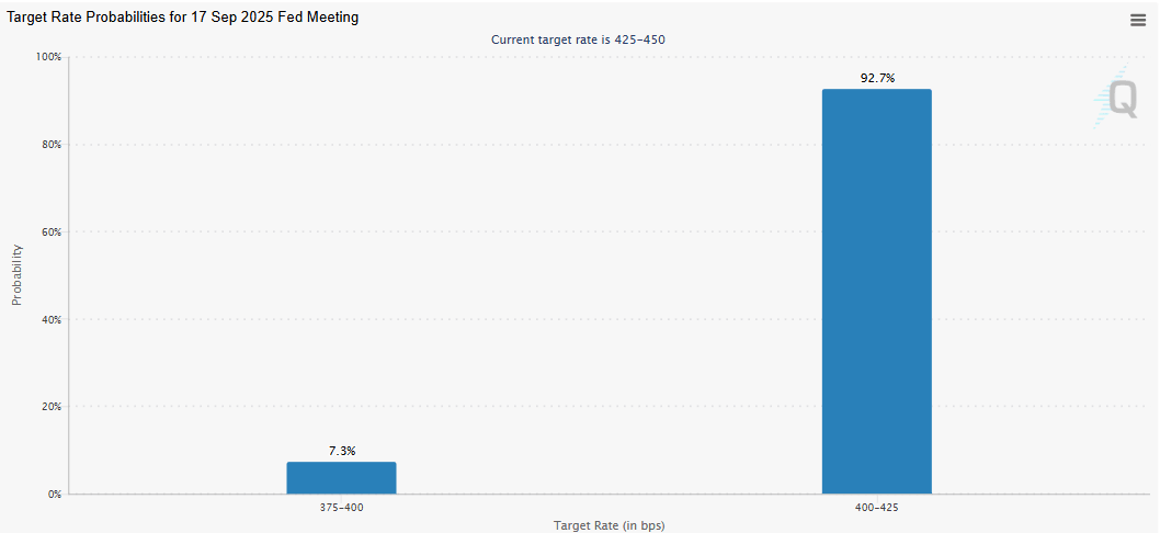 Los participantes del mercado han casi valorado completamente tres recortes de tasas para el resto del año. La herramienta FedWatch del CME Group muestra una posibilidad del 92.7% de un recorte de tasas de interés de 25 puntos básicos (pb) y una probabilidad del 7.3% de un recorte jumbo de 50 pb en la reunión de septiembre de la Fed.