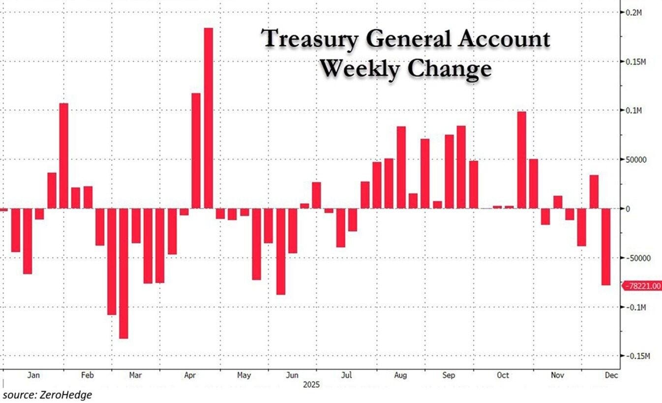 El informe explicó que la Cuenta General del Tesoro (TGA) cayó a 78 mil millones de dólares durante la última semana, la mayor inyección de liquidez desde junio, como se muestra en el gráfico a continuación. El analista señaló que la TGA es la cuenta de efectivo principal del gobierno de EE.UU. en la Reserva Federal (Fed), y que cuando disminuye, el efectivo fluye directamente al sistema financiero, aumentando la liquidez.