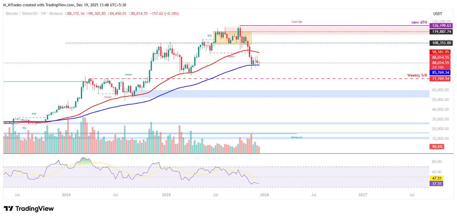 El gráfico semanal de Bitcoin muestra que el precio encuentra soporte alrededor de la media móvil exponencial (EMA) de 100 semanas en 85.769$, consolidándose en esta zona desde finales de noviembre. A partir de esta semana, el BTC se cotiza alrededor de 88.000$.