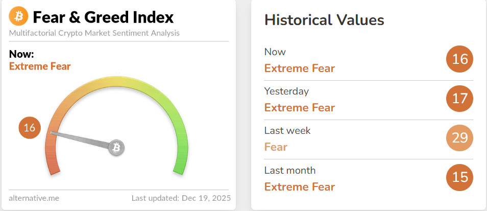 El Índice de Miedo y Codicia cayó a 16 el viernes desde 29 la semana anterior, sugiriendo que el mercado de criptomonedas se encuentra actualmente en una profunda fase de aversión al riesgo, en línea con la caída de precios, las salidas de ETFs y el débil impulso.