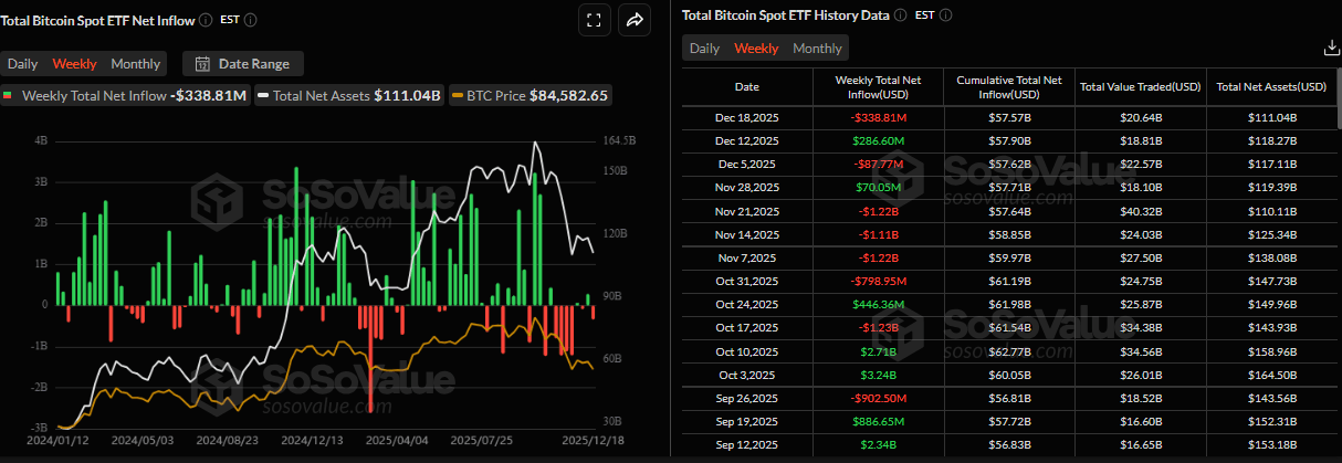La corrección del precio del Bitcoin esta semana fue respaldada por el debilitamiento de la demanda institucional. Los datos de SoSoValue muestran que los ETF de Bitcoin al contado registraron una salida neta total de 338,81 millones de dólares hasta el jueves, marcando la mayor salida semanal desde el 21 de noviembre y rompiendo la racha de entradas positivas de la semana anterior. Si estas salidas continúan e intensifican, el precio del Bitcoin podría ver una corrección adicional.