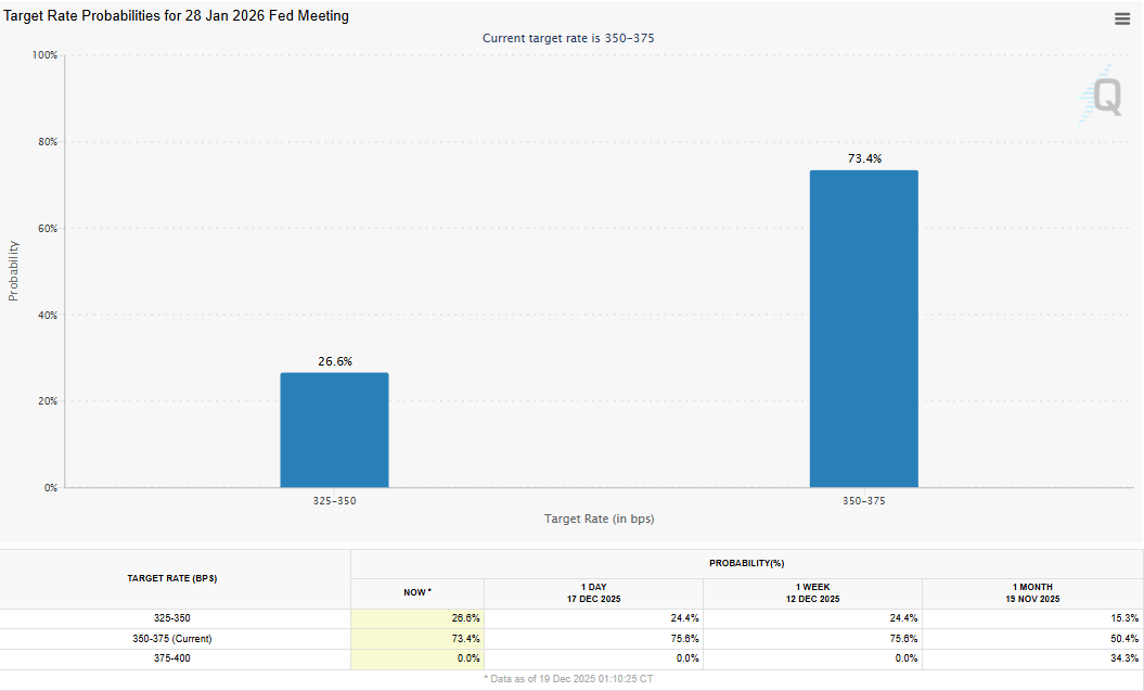 Los participantes del mercado ahora están valorando una probabilidad del 26.6% de que la Fed reduzca las tasas de interés en 25 puntos básicos (pb) al rango de 3.25%-3.50% en su próxima reunión en enero, según la herramienta FedWatch del CME. Estas condiciones macroeconómicas podrían desencadenar un sentimiento de riesgo en los mercados, impulsando activos más arriesgados como el Bitcoin.