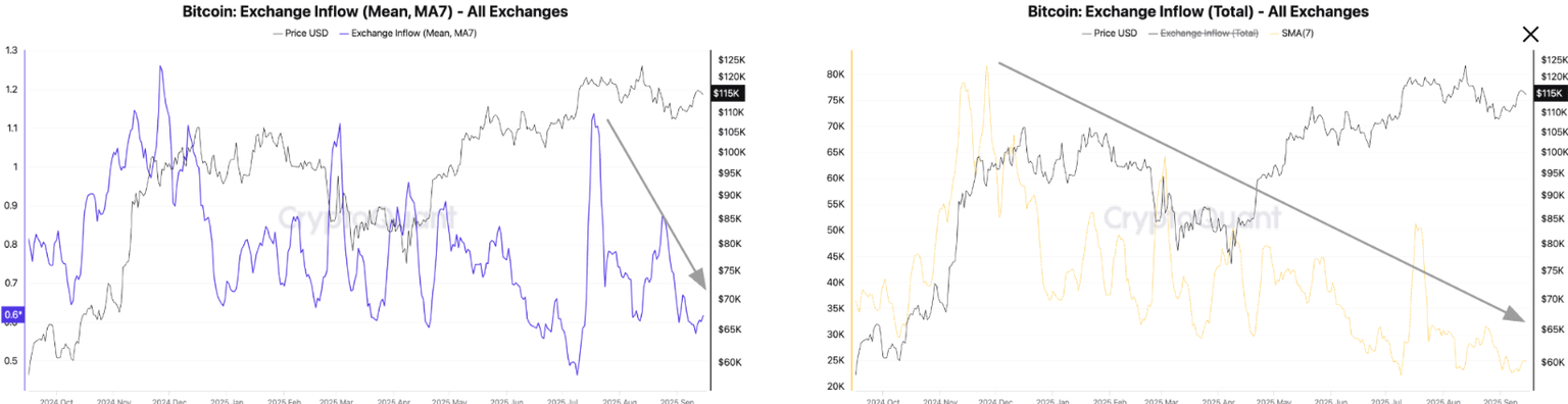 Para el caso alcista, la presión de venta de Bitcoin se mantiene en niveles bajos, ya que los grandes depósitos en exchanges disminuyen. El gráfico a continuación muestra que el total de Bitcoin fluyendo hacia los exchanges ha disminuido a un valor promedio móvil de 7 días de 25.000 BTC, uno de los niveles más bajos en más de un año, y una caída significativa desde los 51.000 BTC el 17 de julio, cuando el Bitcoin se negociaba alrededor de 120.000$ por primera vez en la historia.