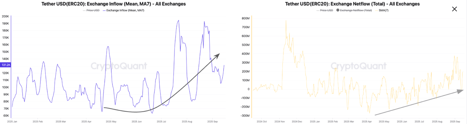 Aparte de esto, el capital seco necesario para un repunte en criptomonedas se está expandiendo, con depósitos totales de USDT en exchanges creciendo a medida que grandes inversores se posicionan antes de la decisión de la Fed. Los depósitos netos de USDT aumentaron de 273 millones de dólares el 6 de abril a 379 millones de dólares el 31 de agosto, el nivel más alto de este año. La mayor cantidad de USDT fluyendo hacia los exchanges es impulsada por grandes depósitos, ya que el depósito diario promedio ha aumentado a 130.000$ el martes desde un mínimo de 63.000$ en julio.