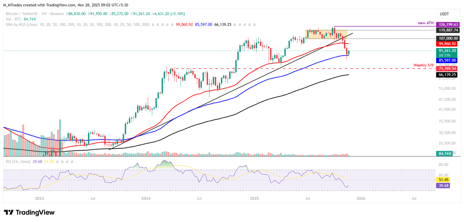 El gráfico semanal del Bitcoin muestra que ha encontrado soporte alrededor de la media móvil exponencial (EMA) de 100 semanas en 85.597$ tras una corrección de cuatro semanas desde finales de octubre. En el momento de escribir el viernes, el BTC se sitúa alrededor de 91.200$, recuperando un 5% hasta ahora esta semana.