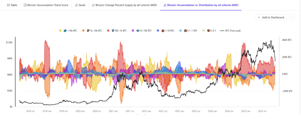 Estas grandes ballenas han continuado distribuyendo, junto con los inversores minoristas (con 0–1 BTC y 1–10 BTC). En general, el BTC podría haber formado un posible mínimo local, apoyado por un fuerte rebote y acumulación de las billeteras de tamaño mediano. Sin embargo, la venta persistente del crucial grupo de 1.000–10.000 BTC sigue limitando la confirmación de una reversión de tendencia más amplia. La actual recuperación de precios es alentadora, pero aún se requiere un cambio decisivo en el comportamiento de las ballenas para señalar el final de la fase bajista.