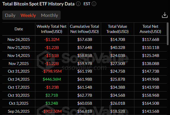 La demanda institucional de Bitcoin muestra una reducción en la presión de venta en comparación con semanas anteriores. Según datos de SoSoValue, los ETFs de Bitcoin al contado listados en EE.UU. registraron una salida total de 1,32 millones de dólares hasta el miércoles en una semana acortada debido al Día de Acción de Gracias el jueves, tras una racha masiva de salidas desde finales de octubre. Para que el BTC continúe su recuperación, los flujos de los ETFs deberían volverse positivos e intensificarse.