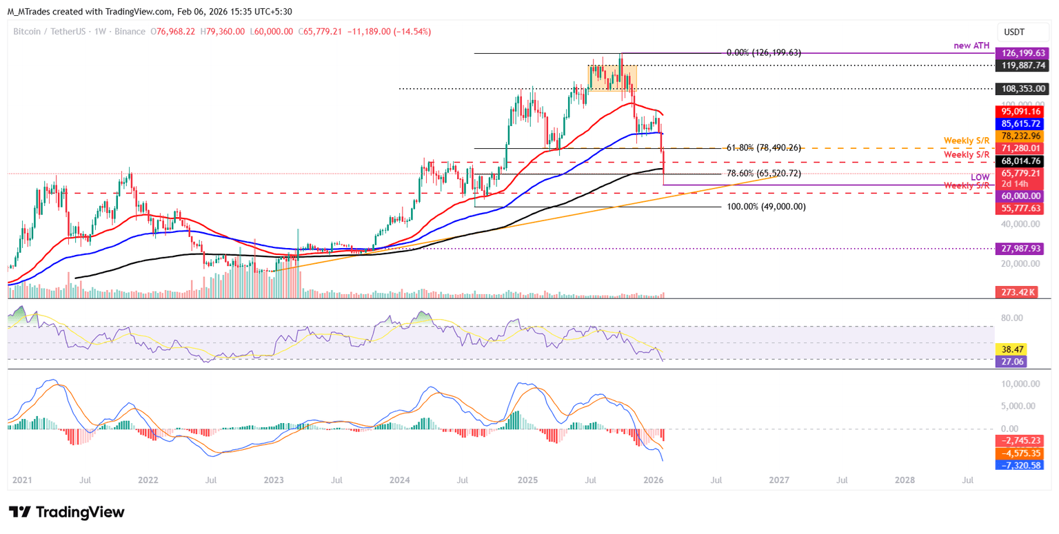 Si el BTC cierra por debajo del nivel de retroceso de Fibonacci del 78.6% (dibujado desde el mínimo de agosto de 2024 de 49.000$ hasta el máximo histórico de octubre de 2025 de 126.199$) en 65.520$ de manera semanal, podría extender la caída hacia el siguiente soporte semanal en 55.777$, que coincide aproximadamente con la línea de tendencia ascendente (dibujada uniendo múltiples mínimos desde diciembre de 2022).