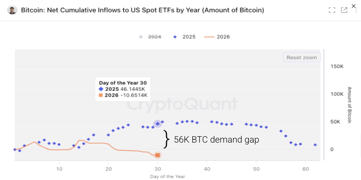 Un análisis más profundo de la demanda institucional revela que la demanda de BTC ha revertido materialmente. El gráfico de CryptoQuant a continuación muestra que, en comparación con el mismo período del año pasado, estos ETFs compraron 46.000 BTC en términos netos, contribuyendo al crecimiento de la demanda de Bitcoin. Sin embargo, los ETFs han sido vendedores netos de Bitcoin hasta ahora en 2026, reduciendo sus tenencias en 10.600 BTC, dejando un déficit de 56.000 BTC en comparación con el año pasado. Esto ha llevado a una menor demanda y mayor presión vendedora.