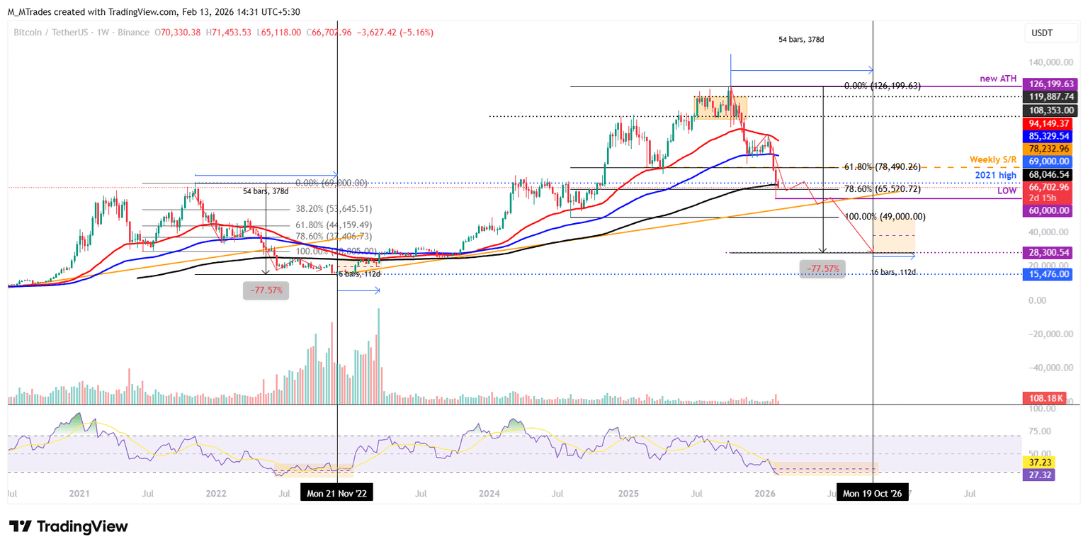 En el período 2025-2026, el BTC alcanzó un nuevo ATH de 126.199$ en octubre de 2025 y desde entonces ha corregido un 46% hasta la segunda semana de febrero, al momento de escribir el viernes, cayendo por debajo de la media móvil exponencial de 200 semanas en 68.046$.