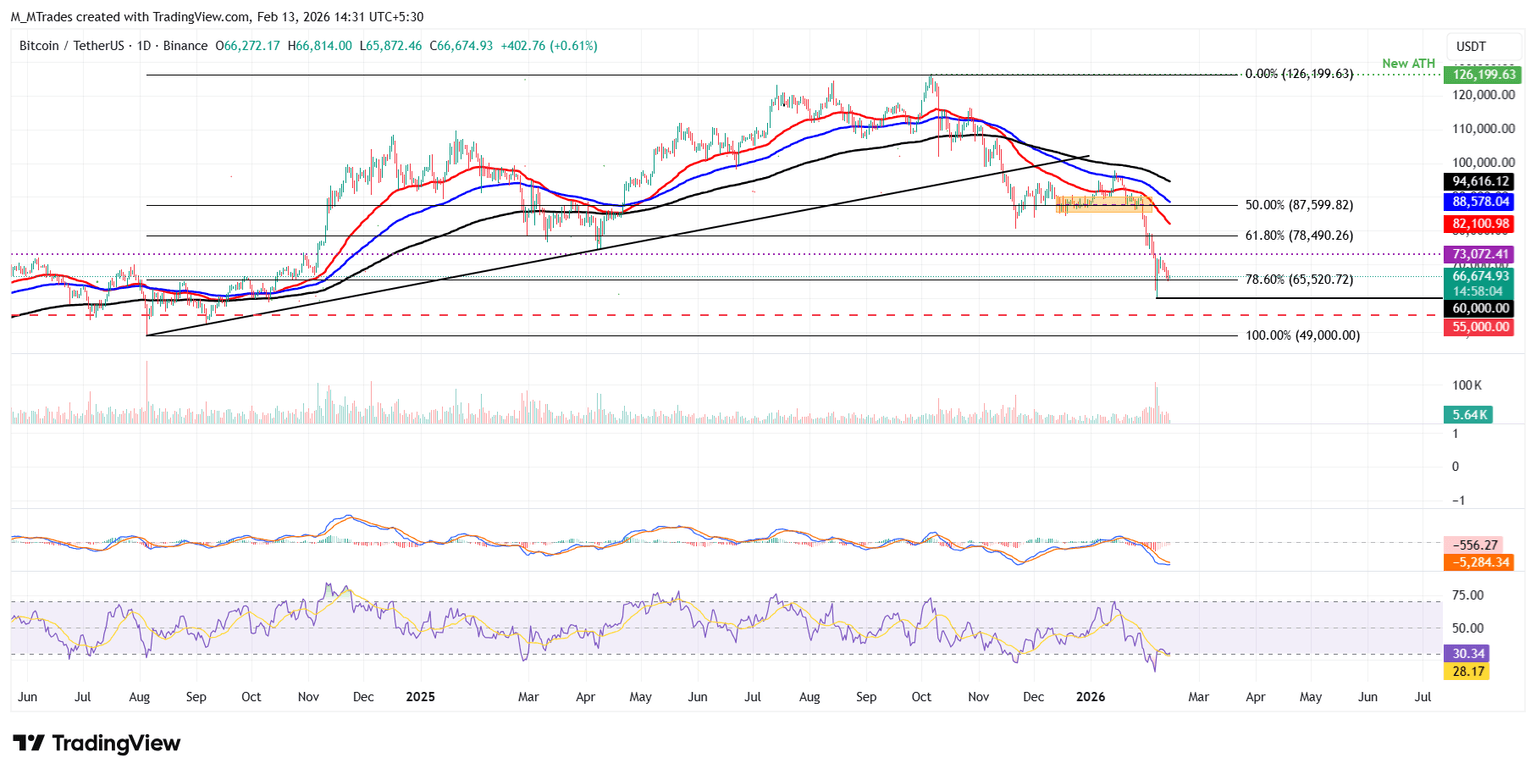 Si el BTC rompe y cierra por debajo de 65.520$, podría extender la caída hacia el mínimo del 6 de febrero en 60.000$.