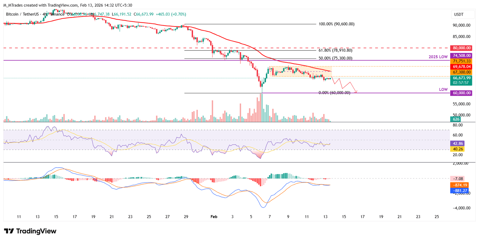 Si el BTC enfrenta rechazo desde el límite inferior de consolidación en 67.300$, podría extender la corrección para volver a visitar el mínimo del 6 de febrero en 60.000$.