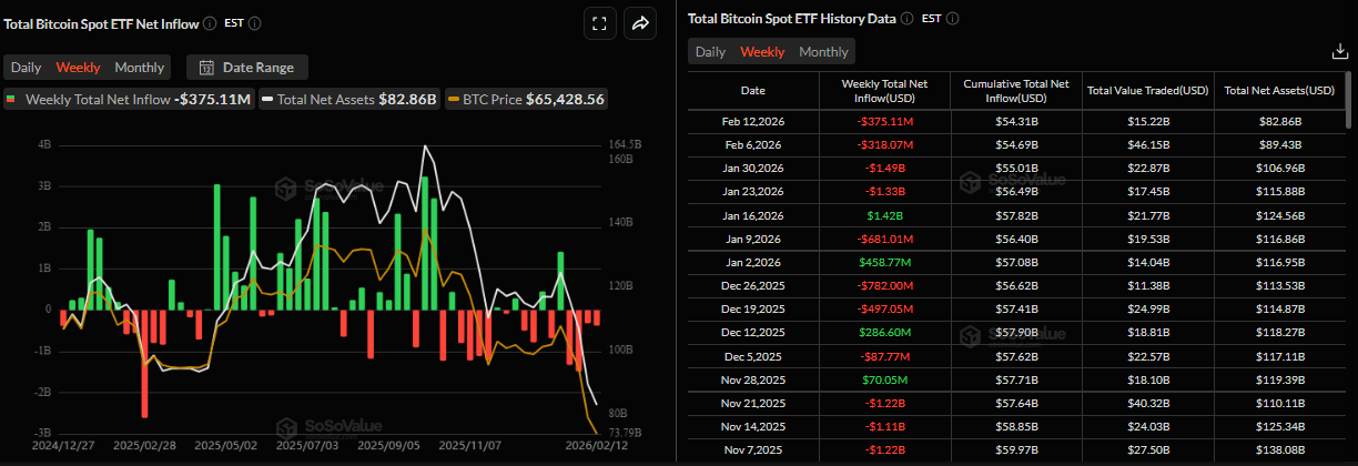 La demanda institucional por Bitcoin continúa debilitándose. Según los datos de SoSoValue, las salidas de los ETF de Bitcoin al contado se mantuvieron robustas hasta el jueves, totalizando 375,11 millones de dólares. Estos retiros apuntan a una cuarta salida semanal consecutiva, sin lograr apoyar los precios de BTC. Si esta tendencia continúa, BTC podría ver una corrección adicional en las próximas semanas.