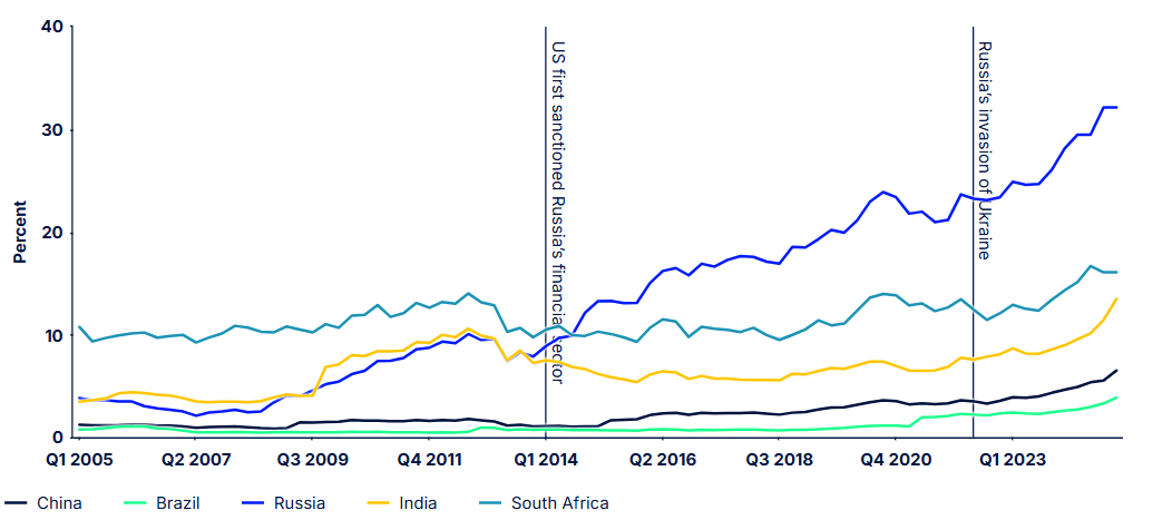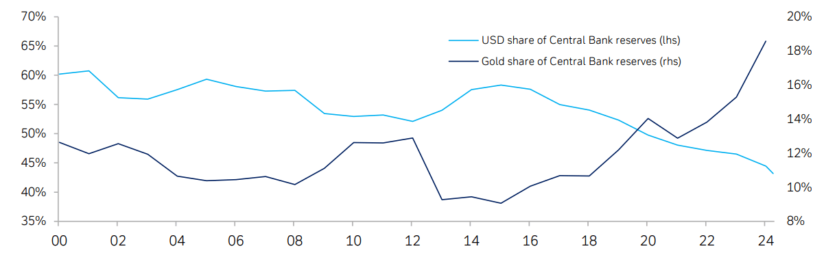 La demanda de Oro por parte de los bancos centrales ha continuado siendo elevada a pesar de que las reservas han aumentado, con una encuesta de 2025 del Consejo Mundial del Oro a gerentes de bancos centrales que muestra las proporciones más altas jamás registradas que esperan que tanto su propia institución (43%) como los bancos centrales globales en conjunto (95%) aumenten sus reservas de Oro en los próximos 12 meses. La participación del USD en las reservas de los bancos centrales está cayendo, mientras que la participación del Oro está aumentando constantemente, como se muestra a continuación.