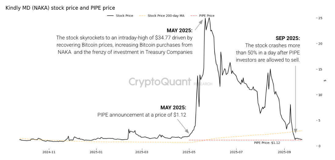 CryptoQuant destacó que las empresas de tesorería de Bitcoin que recaudaron capital a través de Inversión Privada en Capital Público (PIPE) han experimentado caídas significativas, con precios de acciones que a menudo regresan a sus niveles de emisión de PIPE.