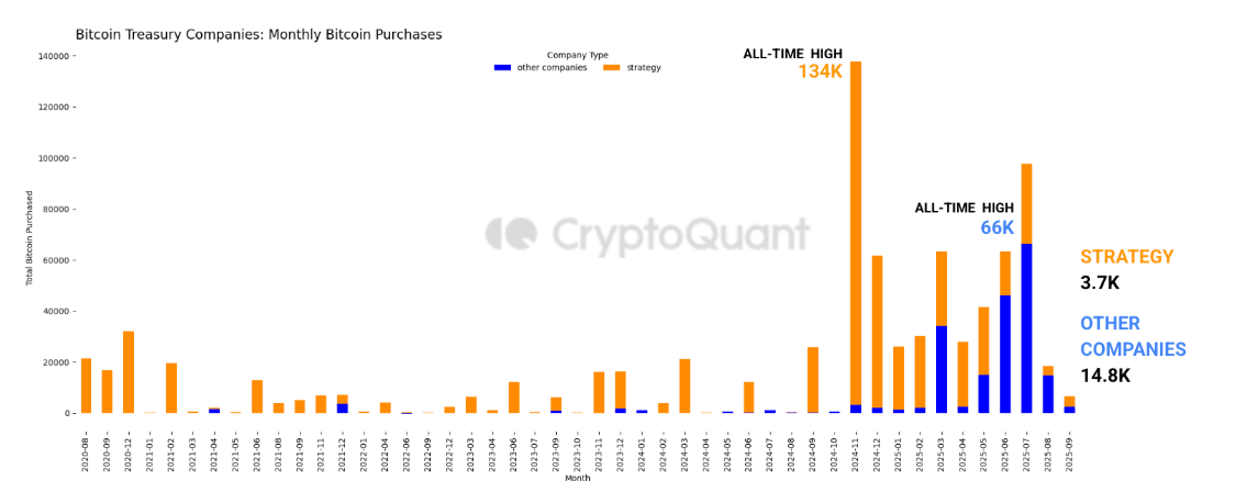 En el lado corporativo, la cantidad total de Bitcoin comprada por empresas corporativas disminuyó significativamente. En agosto, Strategy adquirió 3.700 BTC, mientras que otras empresas de tesorería compraron 14.800 BTC. Esto es significativamente menor que los 134.000 Bitcoins comprados por Strategy en noviembre de 2024 y los 66.000 Bitcoin comprados por otras empresas en junio de 2025, sus respectivas compras récord. Las compras de agosto también cayeron por debajo de los promedios mensuales de 2025, 26.000 BTC para Strategy y 24.000 BTC para otras empresas.