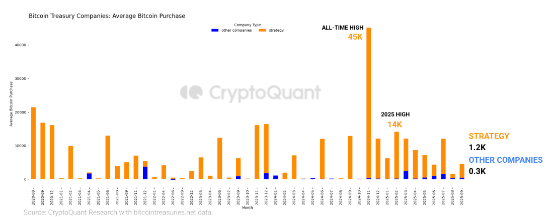 Además, las empresas de tesorería están comprando menos Bitcoin por transacción. En agosto, el tamaño promedio de compra de Strategy cayó a 1.200 BTC, el más bajo en un año, en comparación con un pico de 14.000 BTC en 2025 y un máximo histórico de 45.000 BTC en noviembre de 2024. Mientras tanto, las otras empresas de tesorería de Bitcoin compraron un promedio de 343 Bitcoin por transacción, un 86% menos que sus máximos de 2025 de 2.400 Bitcoin alcanzados en marzo.