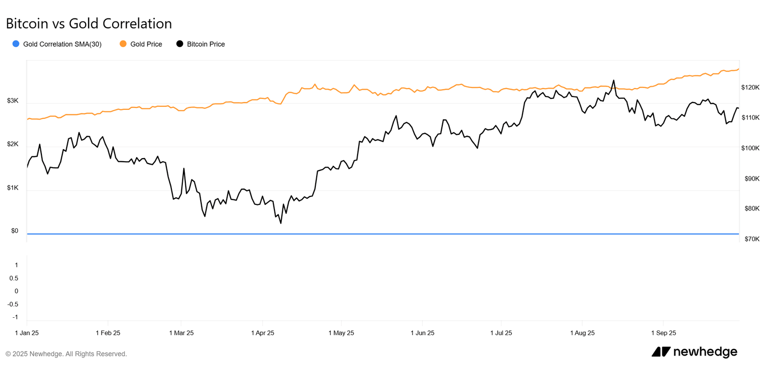Bitcoin y Oro, a menudo comparados como almacenes alternativos de valor, exhibieron una correlación cercana a cero en el tercer trimestre de 2025, lo que los convierte en activos complementarios en un portafolio. En el tercer trimestre, el Oro se disparó a medida que el USD se debilitaba, mientras que Bitcoin cayó en medio de la volatilidad de las acciones, destacando los impulsores divergentes.