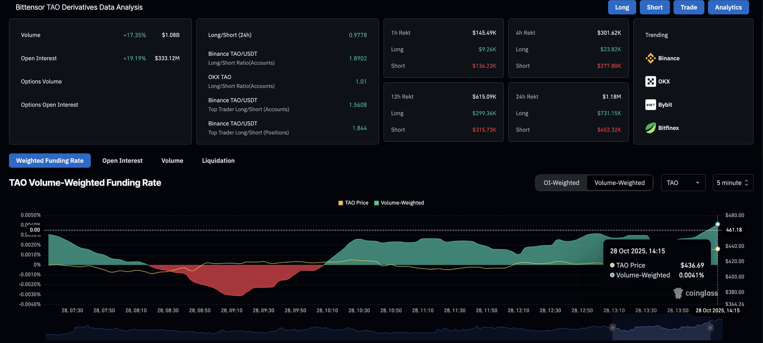 Sumando al potencial alcista, la demanda minorista de TAO está aumentando, según datos de CoinGlass, con el interés abierto de futuros (OI) aumentando un 19.19% en las últimas 24 horas hasta 333.12 millones de dólares. Esto indica un aumento en el valor nocional de todos los contratos de futuros de TAO, ya que los traders aumentan el apalancamiento o añaden nuevas posiciones largas.