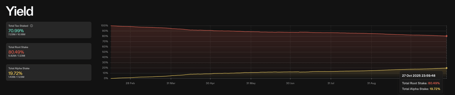 Por otro lado, de los 7.23 millones de tokens TAO apostados en la red, el 19.72% (1.43 millones de tokens) han sido intercambiados por tokens alfa, lo que indica que los usuarios están aumentando su exposición al riesgo en las subredes.
