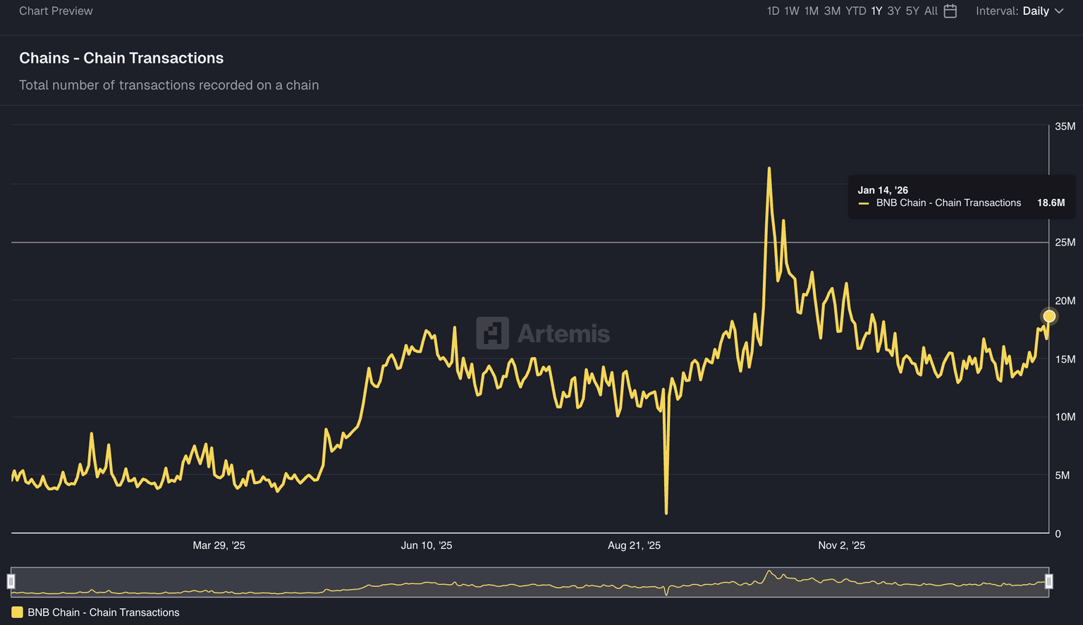 Al mismo tiempo, los datos de Artemis Analytics muestran que las transacciones se situaron en 18.6 millones el miércoles, afirmando la renovada actividad de los usuarios. Un crecimiento constante de la red podría respaldar la demanda de su token nativo, BNB.