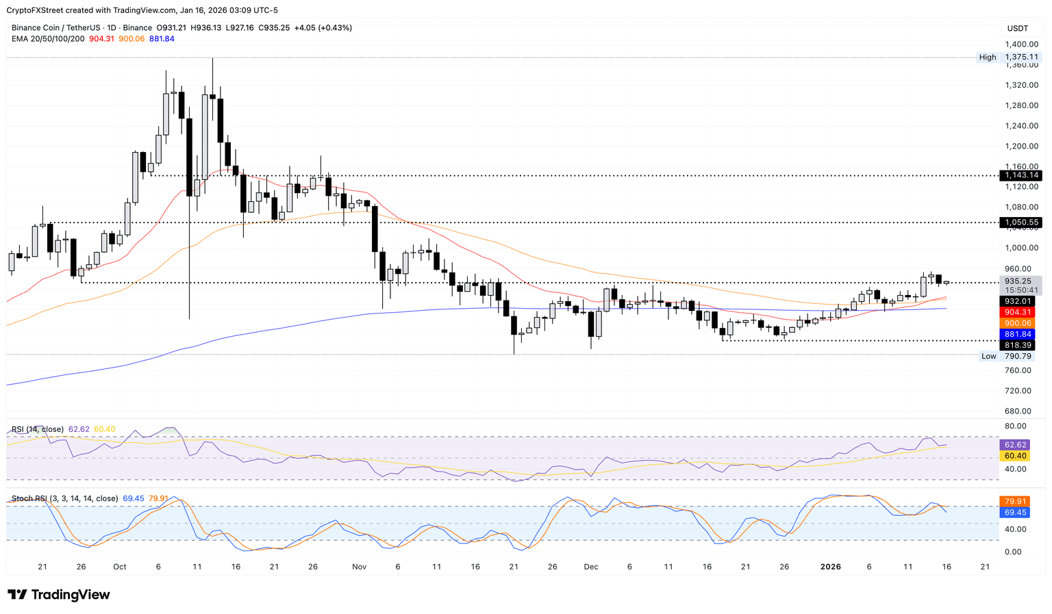El precio de BNB se mantiene por encima de las medias móviles exponenciales (EMAs) clave, con las EMAs de 20, 50 y 200 días en aumento y respaldando el sesgo alcista. Si BNB se recupera por encima de 950$ para superar el retroceso del jueves, podría seguir hacia 1,050$, un nivel de soporte crucial activo en octubre que ahora se ha convertido en resistencia.
