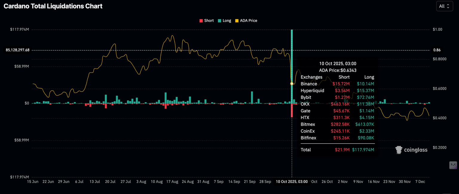 El mercado de derivados de Cardano no se ha recuperado desde la venta masiva del 10 de octubre, que liquidó casi 118 millones de dólares en posiciones largas relacionadas y 22 millones de dólares en cortas. El mercado de criptomonedas en general perdió aproximadamente 19 mil millones de dólares en liquidaciones en un solo día, lo que afectó significativamente el sentimiento.